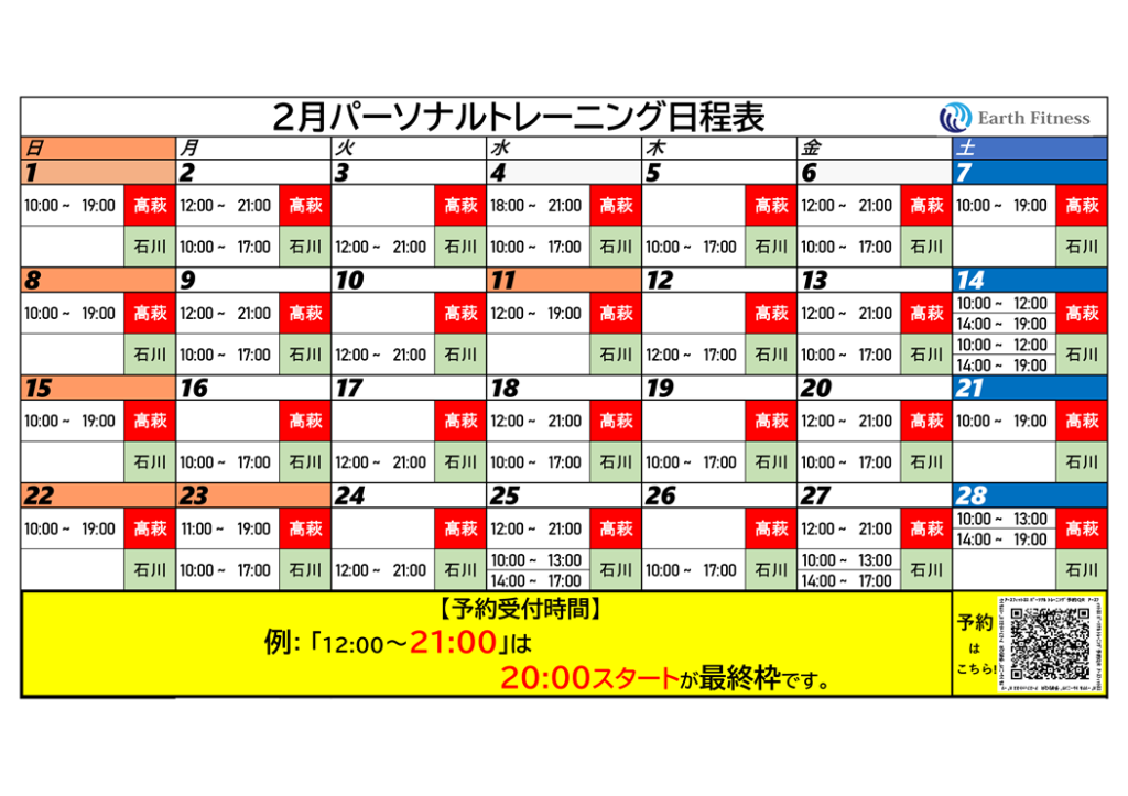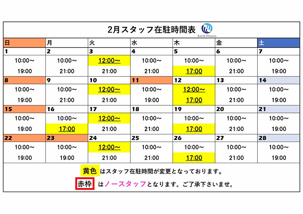2月スケジュールのお知らせ いつもアースフィットネスをご利用いただきありがとうございます。2月の スタッフ在駐時間表 と パーソナルトレーニング日程表 を公開しました。 🔻スタッフ在駐時間黄色の日は在駐開始時間が変更となります。赤枠の日はスタッフ不在日(ノースタッフ)となりますのでご注意ください。※ノースタッフ日は見学・体験、各種手続きができません。 🔻パーソナルトレーニング日程トレーナーごとの担当日を記載しております。人気の時間帯は予約が集中しますので、お早めにご予約ください。