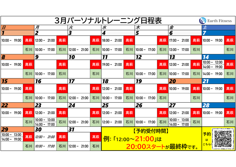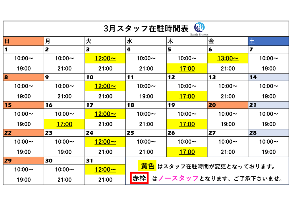 3月スケジュールのお知らせ いつもアースフィットネスをご利用いただきありがとうございます。3月の スタッフ在駐時間表 と パーソナルトレーニング日程表 を公開しました。 🔻スタッフ在駐時間黄色の日は在駐開始時間が変更となります。赤枠の日はスタッフ不在日(ノースタッフ)となりますのでご注意ください。※ノースタッフ日は見学・体験、各種手続きができません。 🔻パーソナルトレーニング日程トレーナーごとの担当日を記載しております。人気の時間帯は予約が集中しますので、お早めにご予約ください。