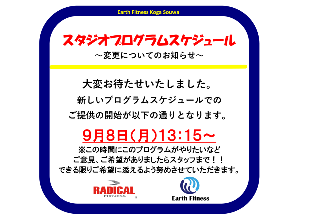 9月より、スタジオプログラムのスケジュールが一部変更となります。